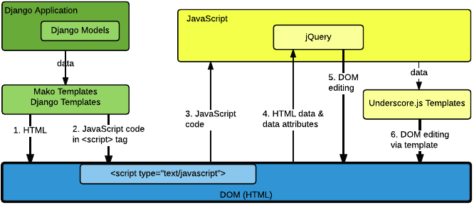 A diagram detailing how data flows from Django applications and Django models through Mako templates and Django templates into an HTML page. Data can then flow from the HTML page into JavaScript, and back down into the DOM through jQuery or Underscore.js templates.