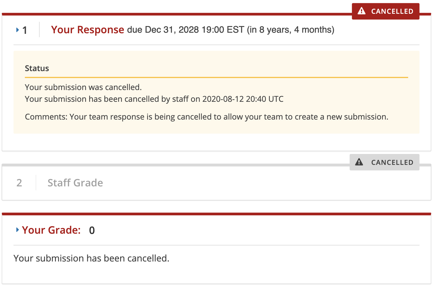 When a learner on the team views the assignment in the course, they will see that all steps in the assignment have a status of “Cancelled”. Under Your Response, instead of the text of their response, they will see the date and time that their response was cancelled, and the comments relating to the removal of their submission.