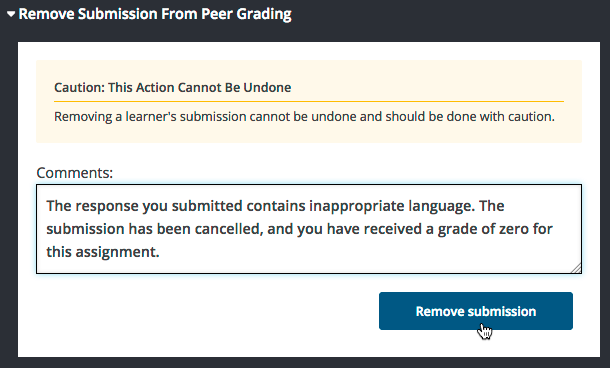 In a course that contains assignments with peer assessment steps, learners might alert you to inappropriate responses that they have seen while performing peer assessments. In such a situation you can locate and remove the response. Doing so removes the response so that it is no longer shown to other learners for peer assessment.