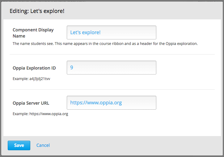 5. In the Oppia Exploration ID field, enter the identifier assigned to the exploration you want to add. For example, qG6kclSxlWZn or gC4_ggkWar-L.