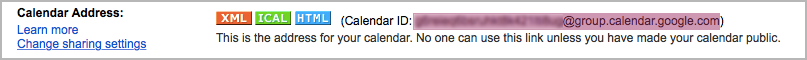 3. Next to the Calendar Address label, look to the right of the three colored XML, ICAL, and HTML buttons. In parentheses, you can see the calendar ID.