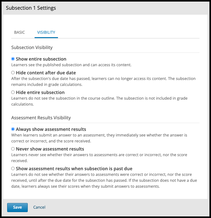 You can make a subsection’s content unavailable based on date. For example, you might want to make exam questions unavailable after a certain date. For instructor-led courses, this option uses the subsection’s due date. For self- paced courses, this option uses the course’s end date.