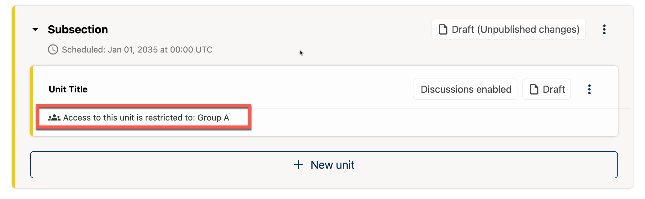 If you have more than one enrollment track in your course, or if you have enabled cohorts, you can limit a unit’s availability to specific groups of learners. For information about offering different content to different learner groups, see Offering Different Content to Different Learner Groups.
