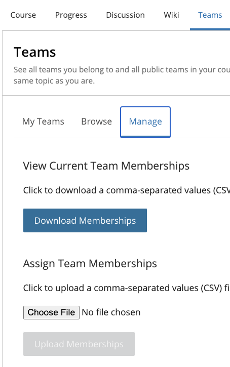 From the Teams > Manage page, an instructor can use a CSV file, formatted per the schema above, to manage team memberships.